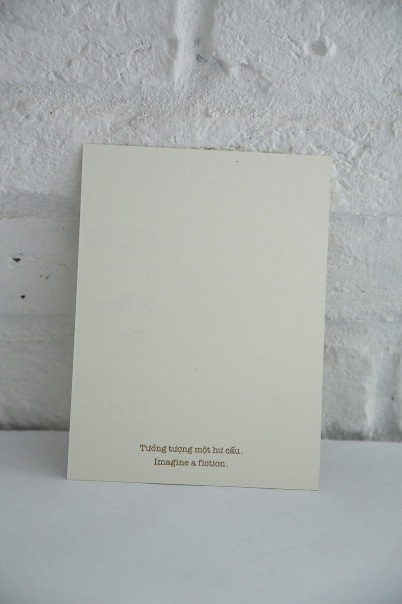 Phan Thảo Nguyên Thao Nguyen Phan Tưởng tượng một hư cấu, 2013 Bưu thiếp Imagine a Fiction, 2013 Postcard Share this: Share on X (Opens in new window) X Share on Facebook (Opens in new window) Facebook Like Loading... Related